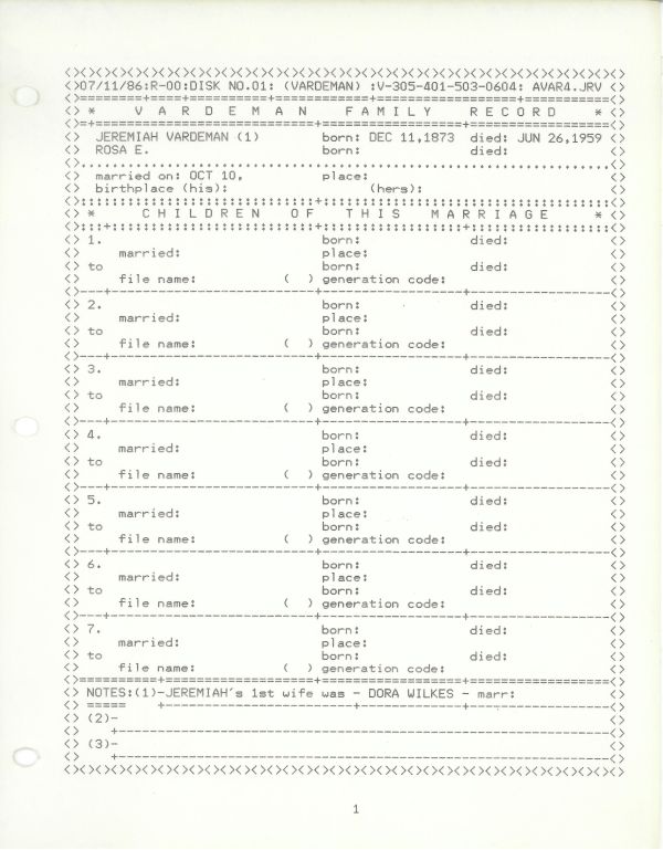 genealogy research pages by Harry Lee "Bud" Vardiman.