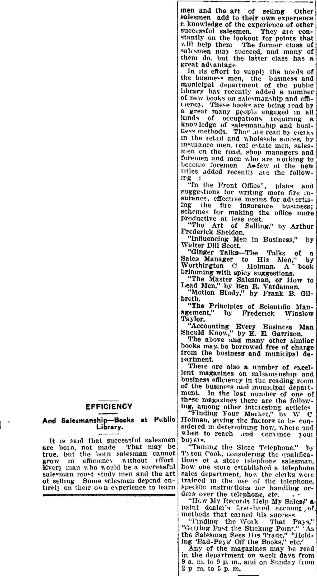 The business and municipal department of the Fort Wayne Public Library added the book "Master Salesman" by B R Vardaman. |