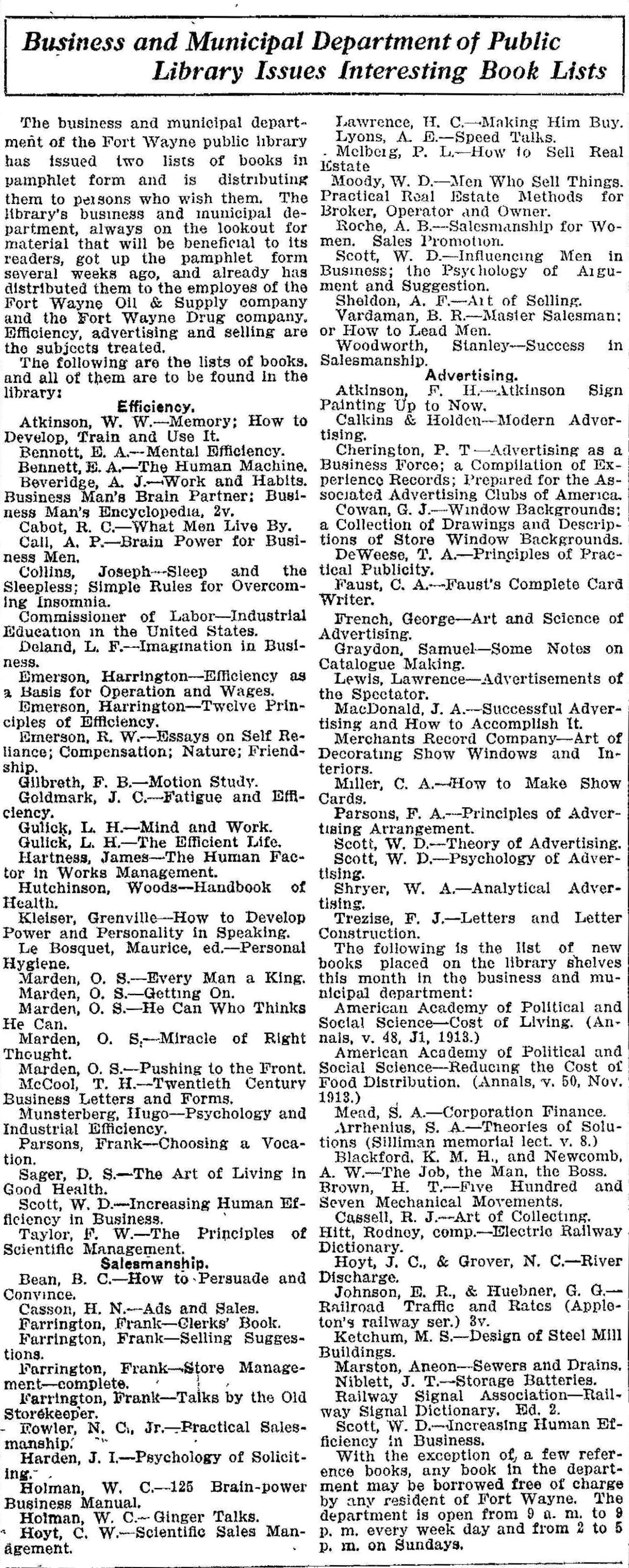 The business and municipal department of the Fort Wayne Public Library has created a pamphlet recommending books in efficiency, advertising and selling.