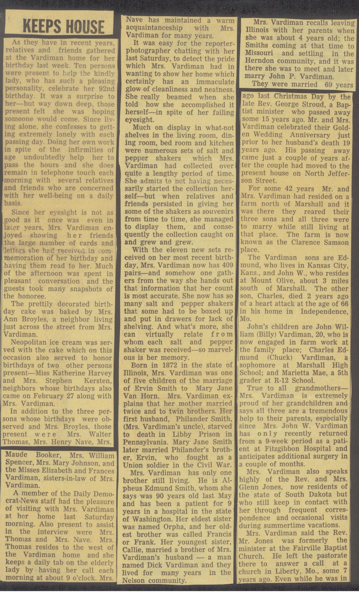 "My Dad’s parents (John Peter Vardiman and Luella May Smith Vardiman) lived on a farm in Marshall, Missouri