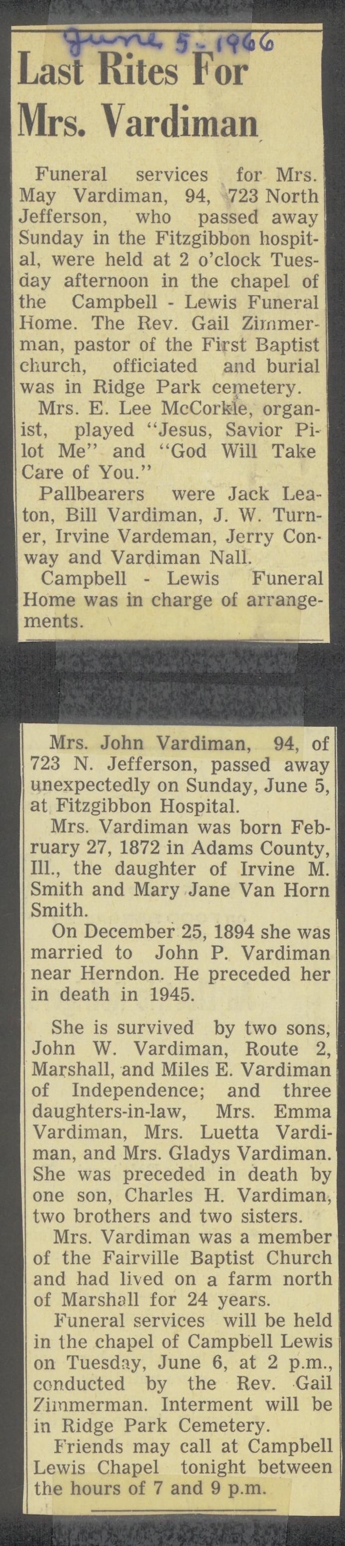 Smith Vardiman, I went to Dad's Bible where Mom had recorded several