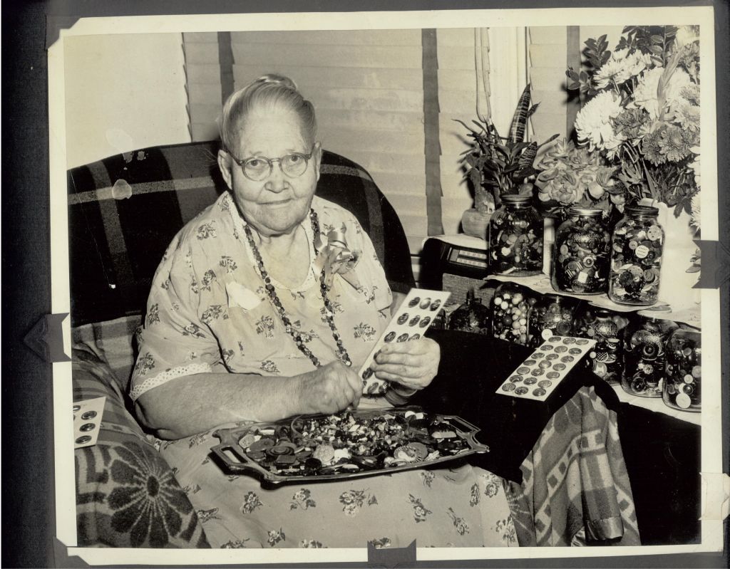 Luella May's sister with her button and coin collection and newspaper article Dec. 8, 1948