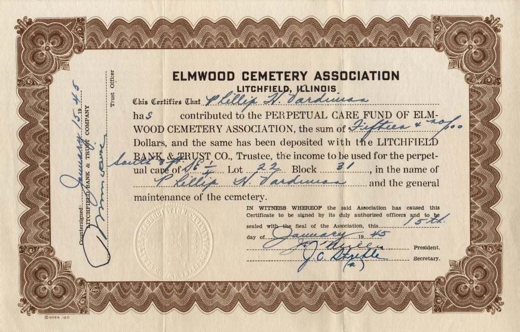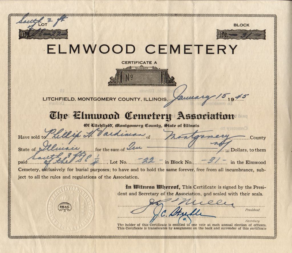 Cemetery in Litchfield, Illinois in Se 1/4, Lot 22, Block 31.