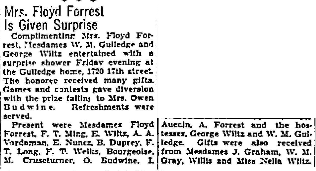 "Mrs. A. A. Vardaman" present at a surprise shower for Mrs. Floyd Forrest.