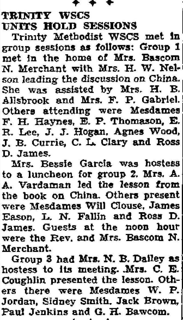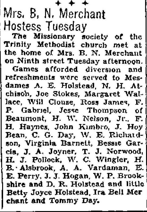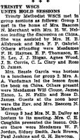 "Mrs. A. A. Vardaman" attended The Missionary society of Trinity Methodist church meeting at the home of Mrs. B. N. Merchant. |