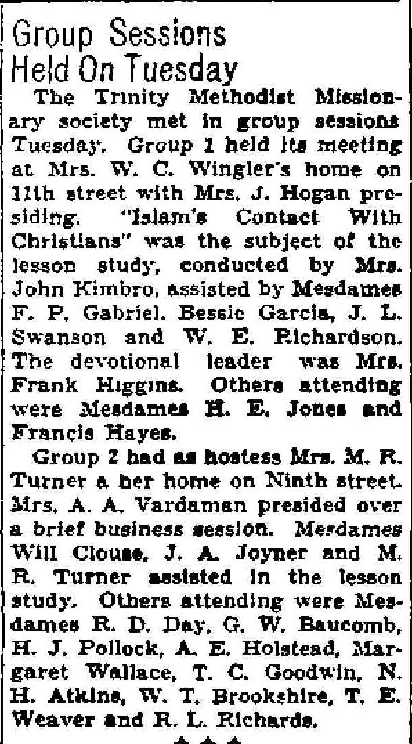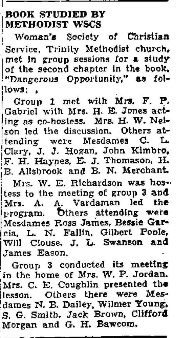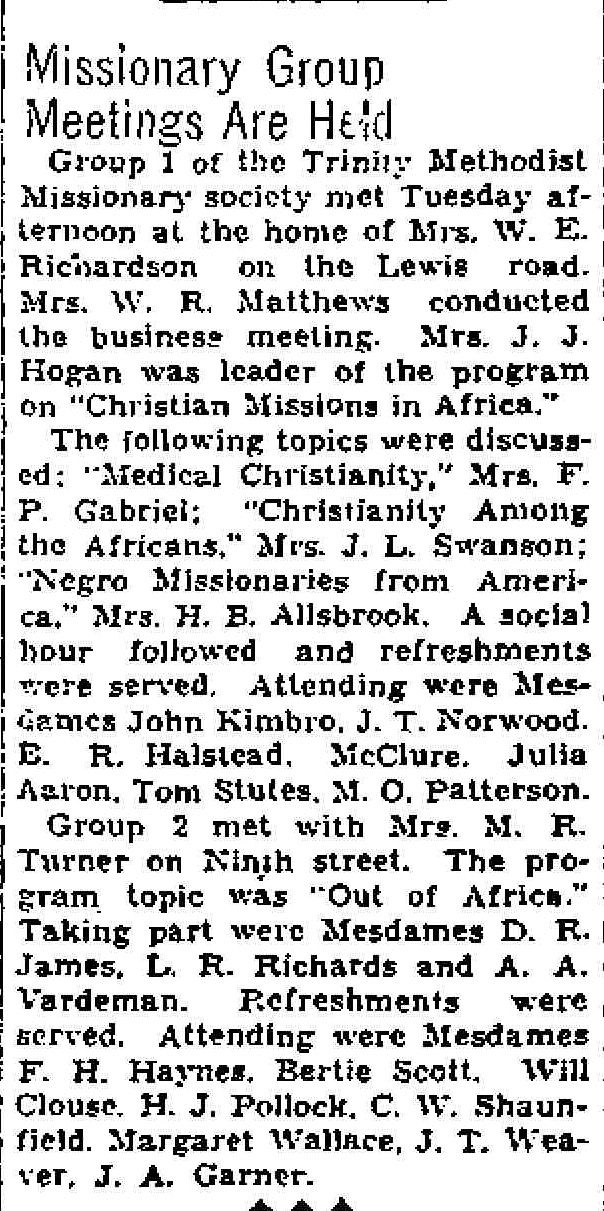 "Mrs. A. A. Vardaman" attended Trinity Methodist Missionary Group