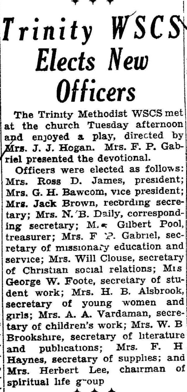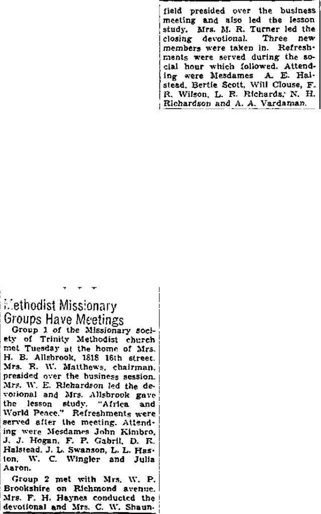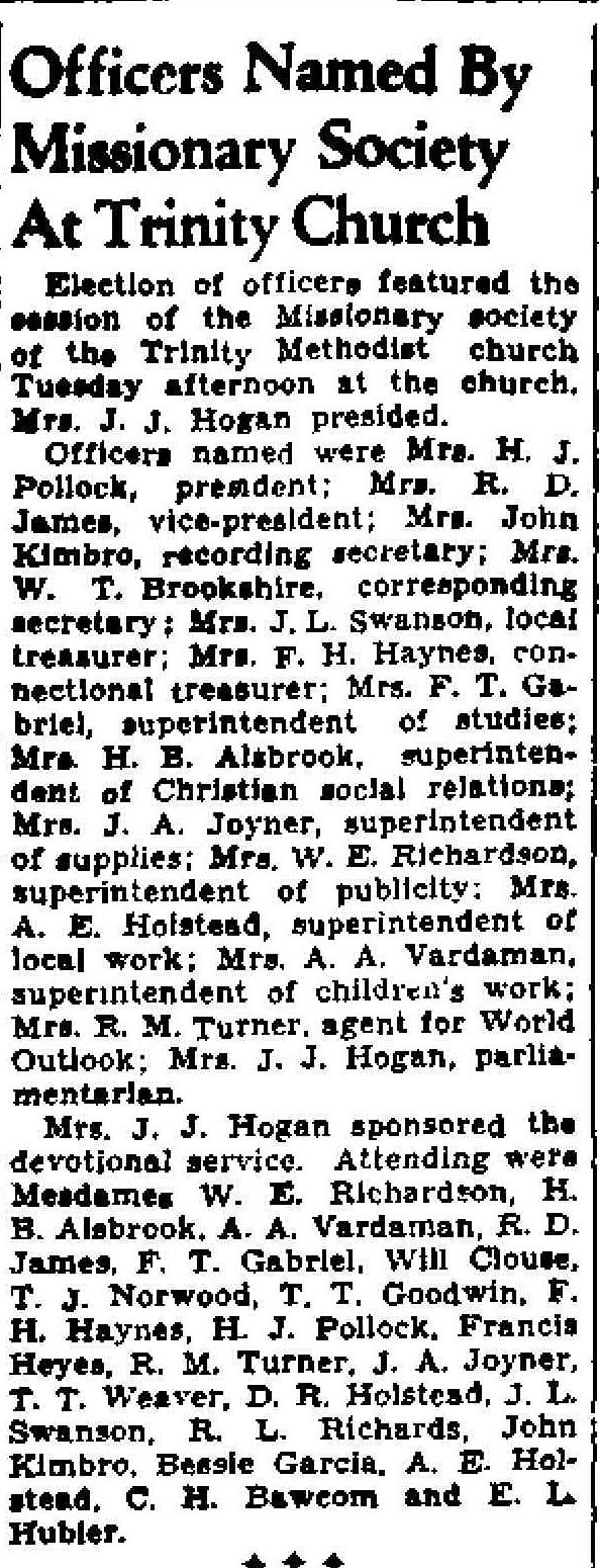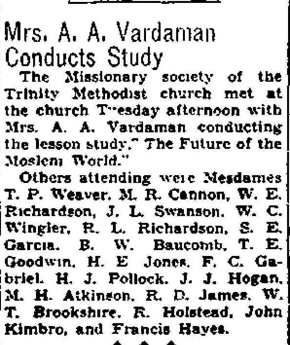"Mrs. A. A. Vardaman"attended The Missionary society of the Trinity Methodist church business