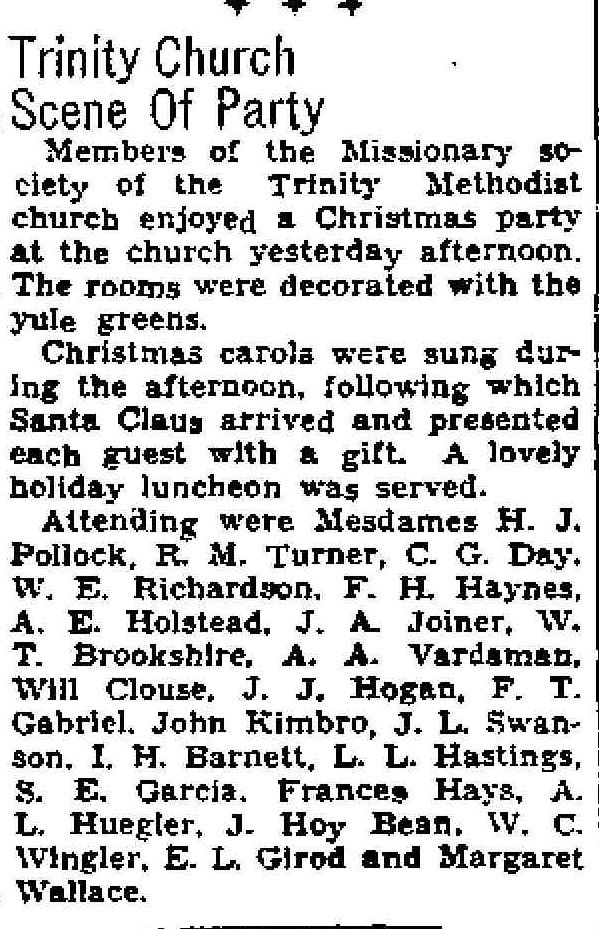 "Mrs. A. A. Vardaman" attended The Missionary society of Trinity Methodist church Christmas party.