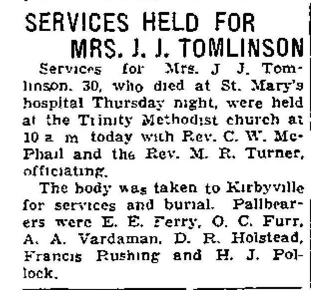 "A. A. Vardaman" pallbearer for Mrs. J.J. Tomlinson's