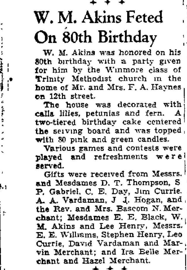 "A. A. Vardaman" and "David Vardaman" attended W.M. Akins 80th Birthday party.