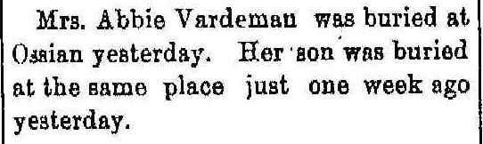 Mrs. Abbie Vardeman buried one week after her son in Ossian.