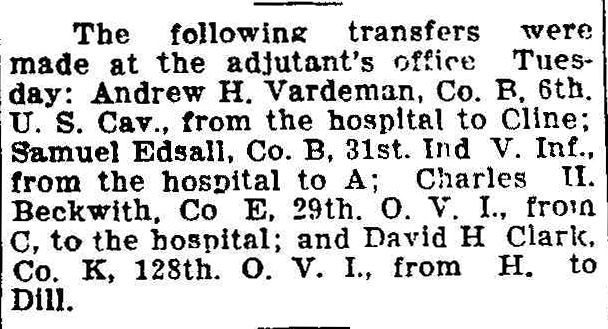 Andrew H. Vardeman, Co. B, 6th U.S. Cav., transferred from hospital to Cline.
